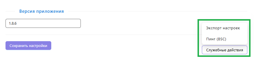 В служебных действиях иногда используются опции пинга блокчейн сети BSC, для того,чтобы проверить ,что работает связь с блокчейном. Также можно сделать экспорт всех настроек