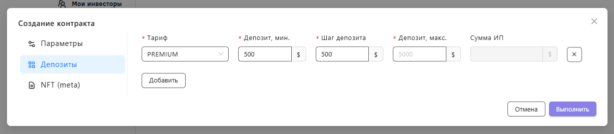 На вкладке Депозиты администратор указывает тарифы, которым будет доступен проект на основе создаваемого контракта, а также минимальный депозит, шаг и максимальный депозит